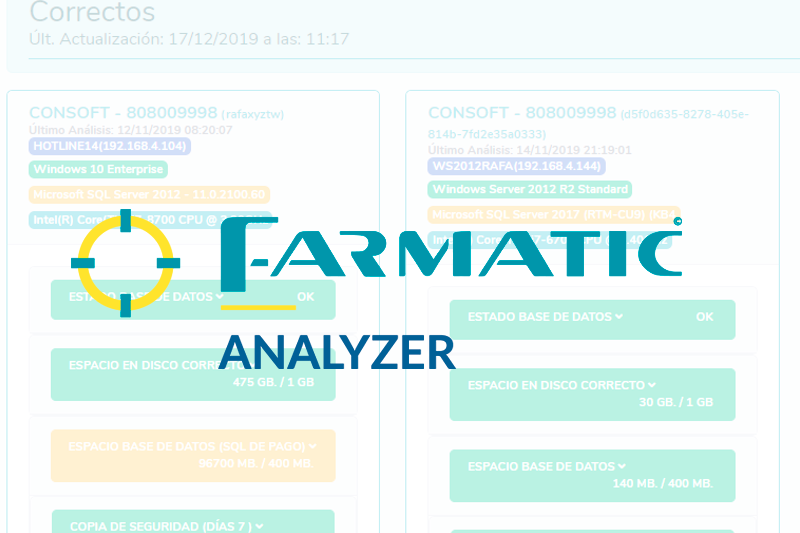 Porque sólo los distribuidores oficiales de Farmatic integrados en el canal de distribución de Consoft tienen acceso al sistema de monitorización online de Farmatic Analyzer. Y cada distribuidor podrá monitorizar solamente a las farmacias a las que presta servicio técnico. De esta forma garantizamos que solo tu distribuidor oficial de mantenimiento de Farmatic tiene acceso al estado de tu sistema. Contacta con tu distribuidor para informarte y/o solicitar este servicio.